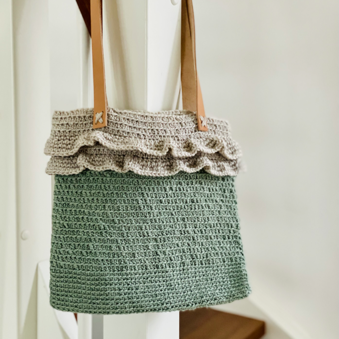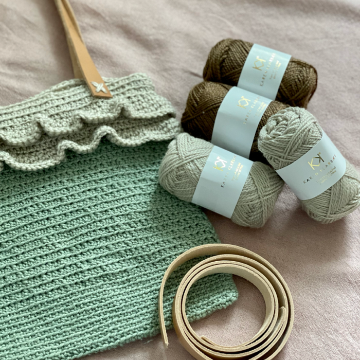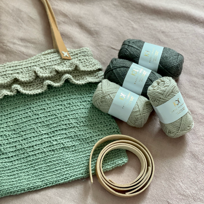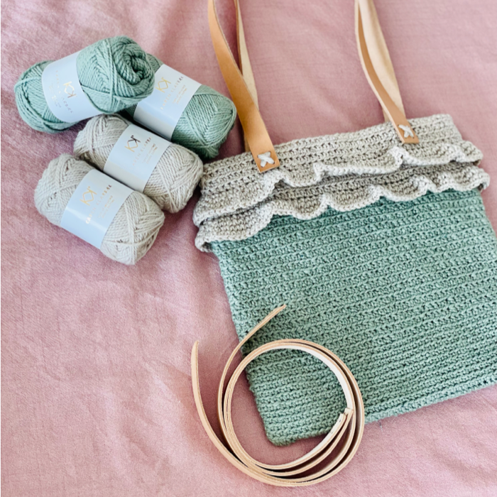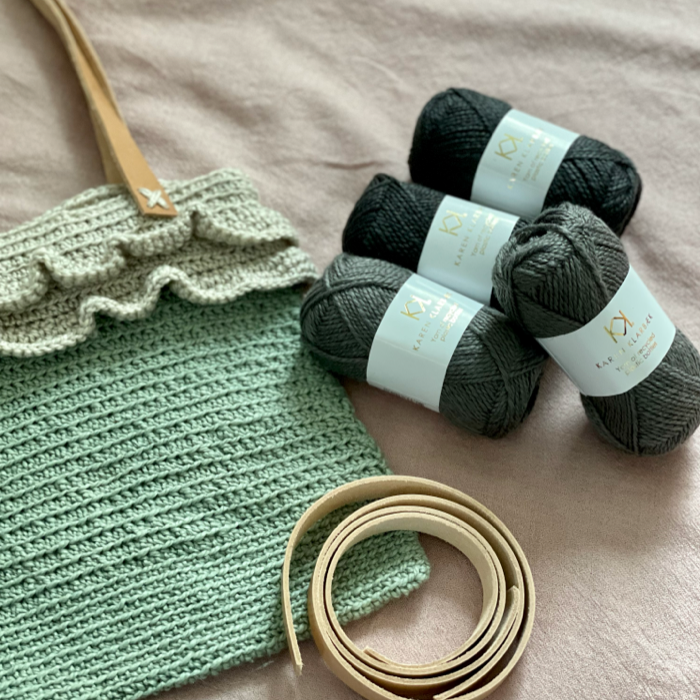 Vi har designet en hæklet taske i praktisk størrelse og med en fin detalje, en hæklet kant i anden farve. Derudover er der læderremme som giver det sidste touch.