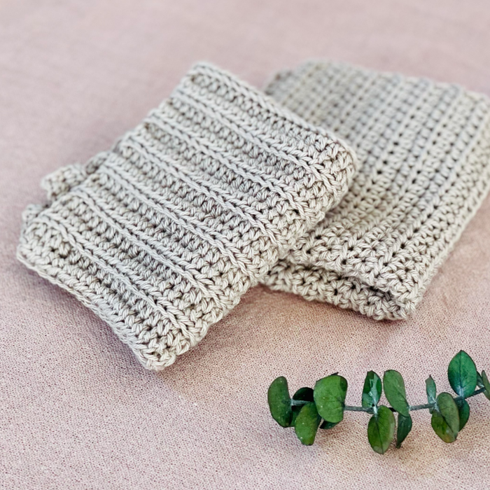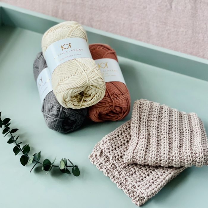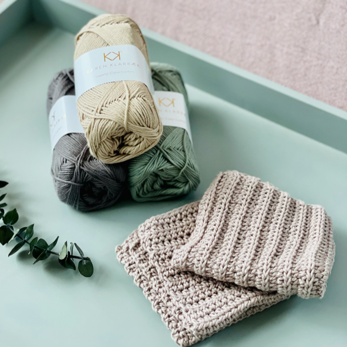 Begyndervenligt hæklekit med opskrift og garn til hæklede klude.