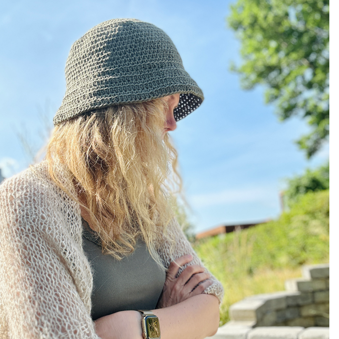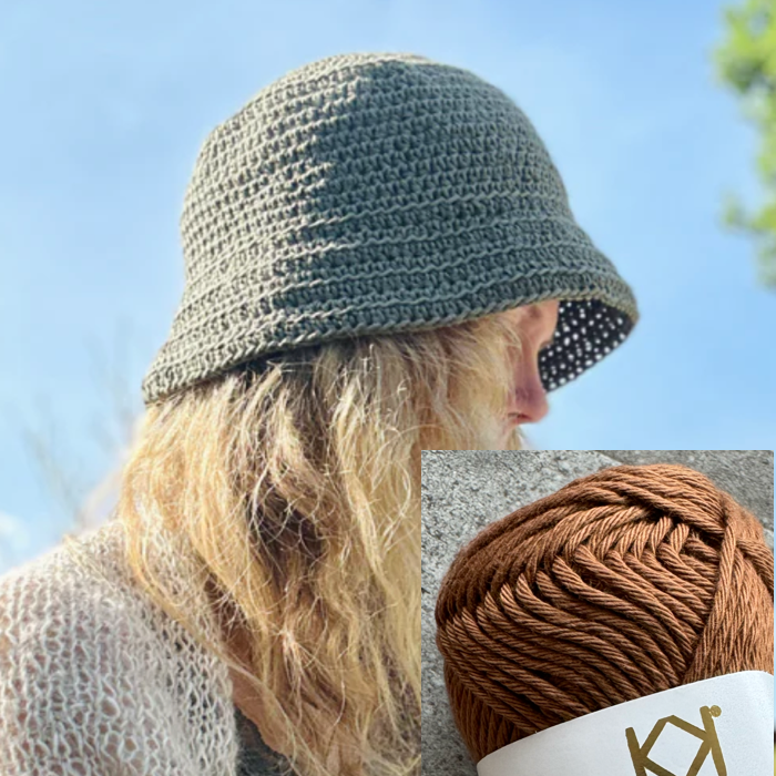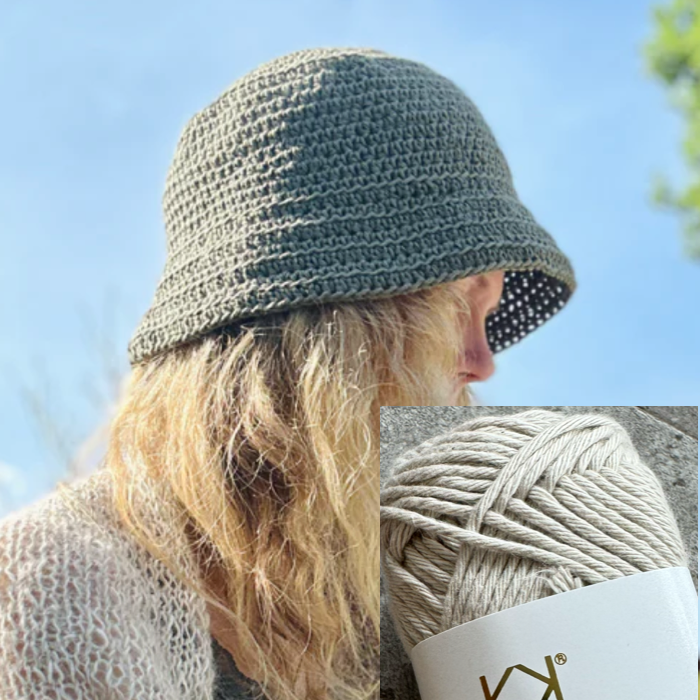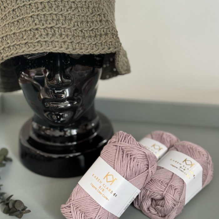 Der hækles med 8/8 bomuld fra Karen Klarbæk og du skal bruge lige under 3 nøgler til en bøllehat. Opskriften indeholder 2 størrelser på bøllehatten.