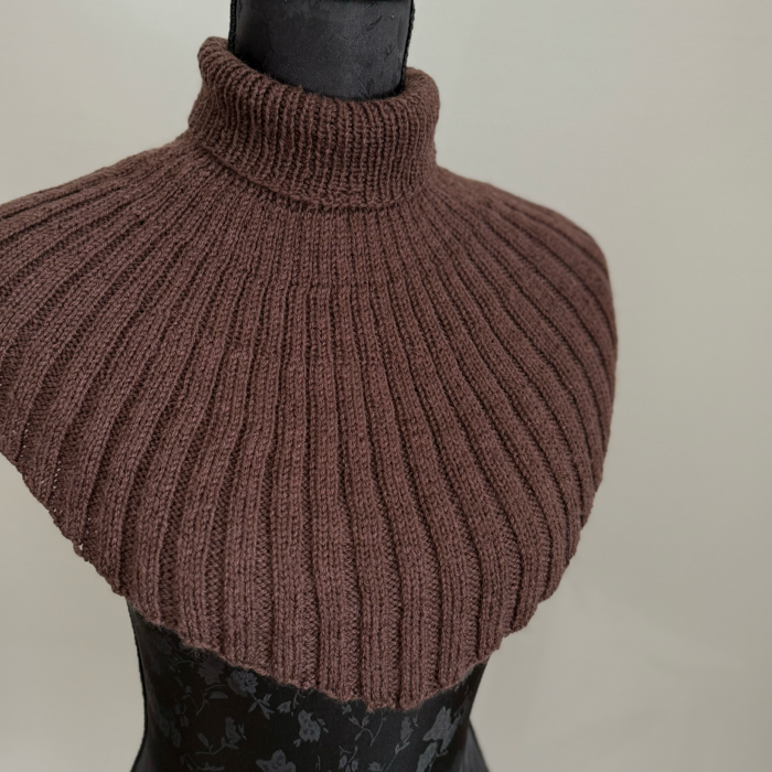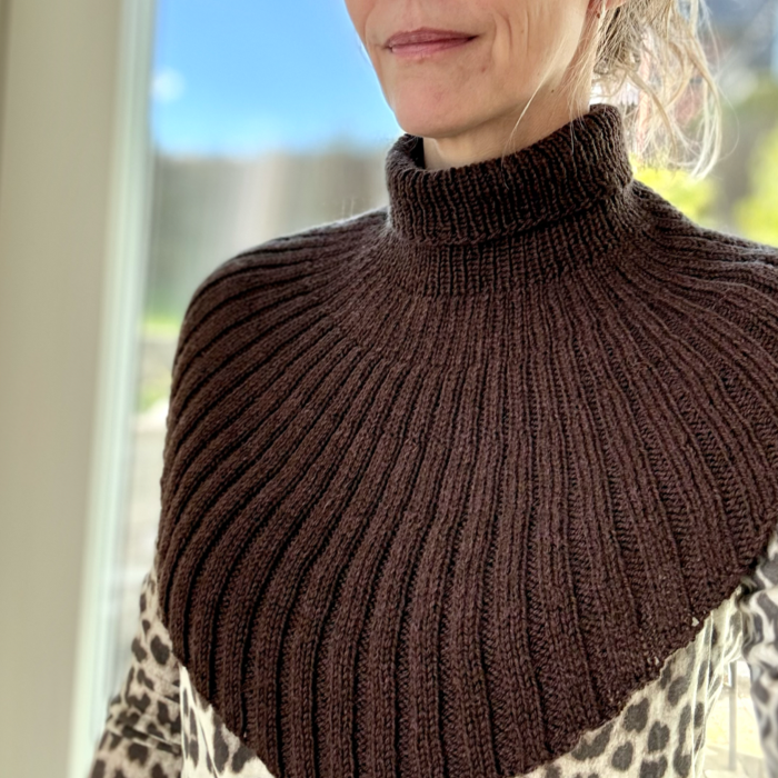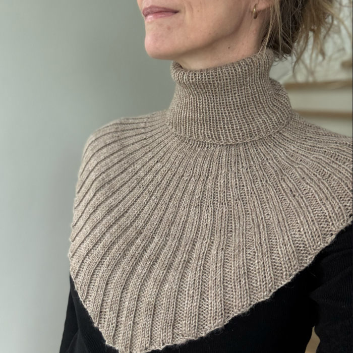 Halsedissen er strikket oppefra og ned, den er strikket rundt og lavet længere foran, hvor den danner en fin spids.
