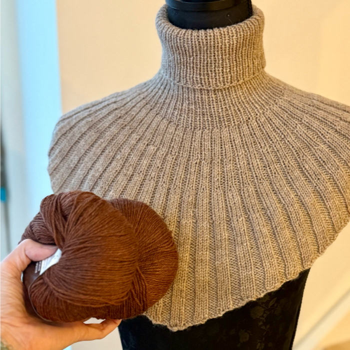 Det kan være en fordel også at have en længere rundpind dvs en størrelse 60 cm. Når man når til de sidste udtagninger, men man kan godt strikke den uden.
