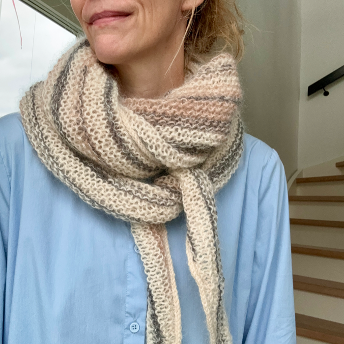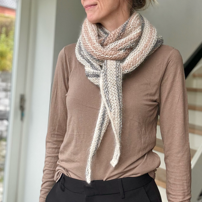 Super lækkert tørklæde, hoodie og sjal med farveskift. Blødt i en blanding af brushed lace og ren uld. Strikket i to tråde på pind 8 mm og i cord kanten er strikket med 4 mm.