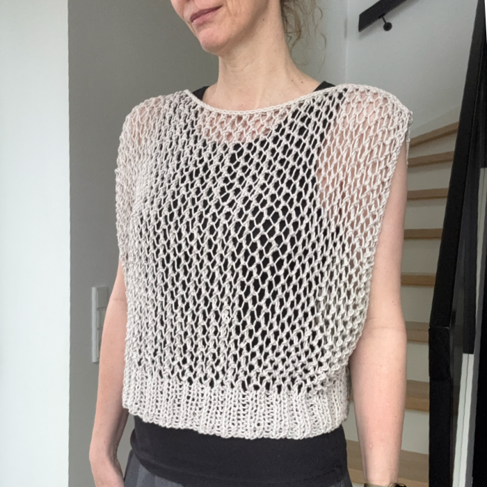 Sommer blusen er strikket i 1 tråd med ribkant forneden, et enkelt hulmønster og en i-cord afslutning foroven. Den er syet sammen i skuldre og sider. Den er strikket på pind 6 mm.