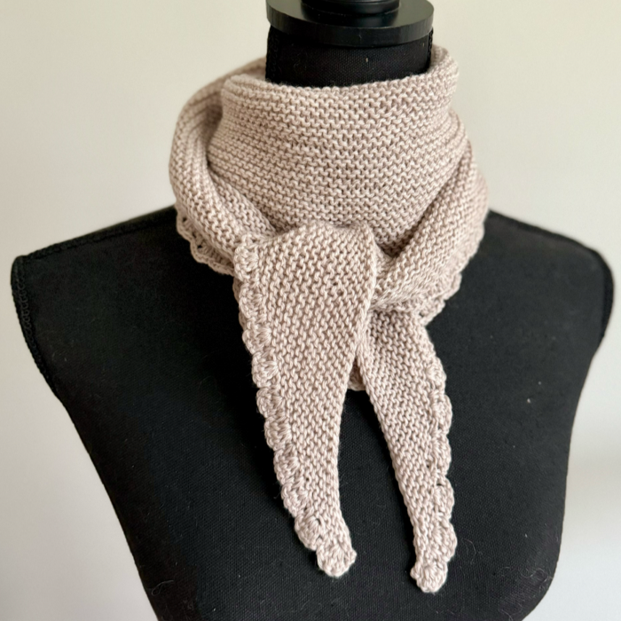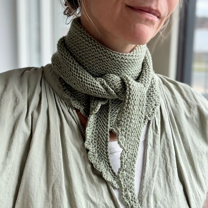 Bandanen er strikket nedefra spids og med udtagninger, hvorefter der er hæklet en muslingekant på. Det bløde York merino kan bruges hele året.