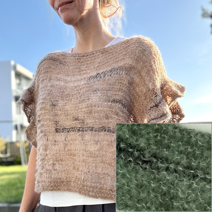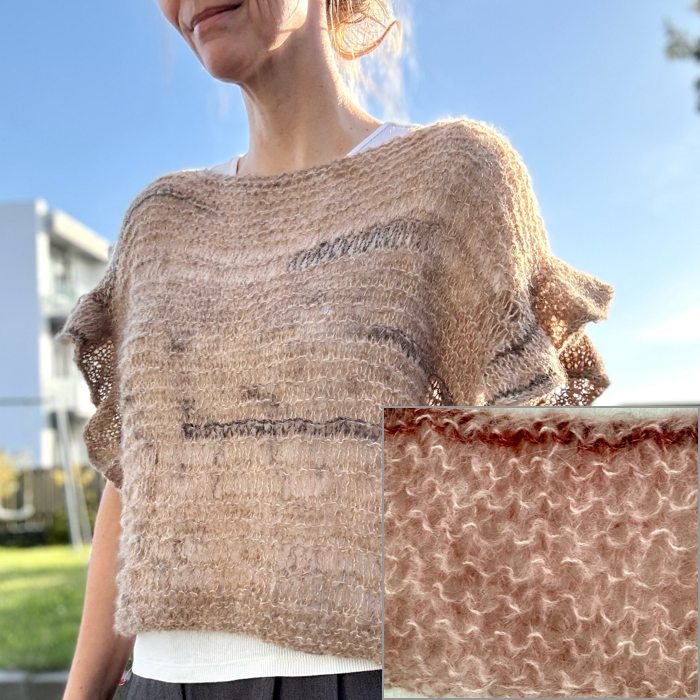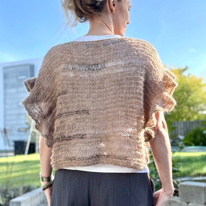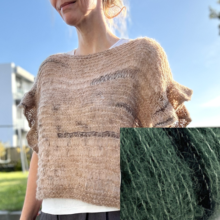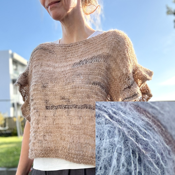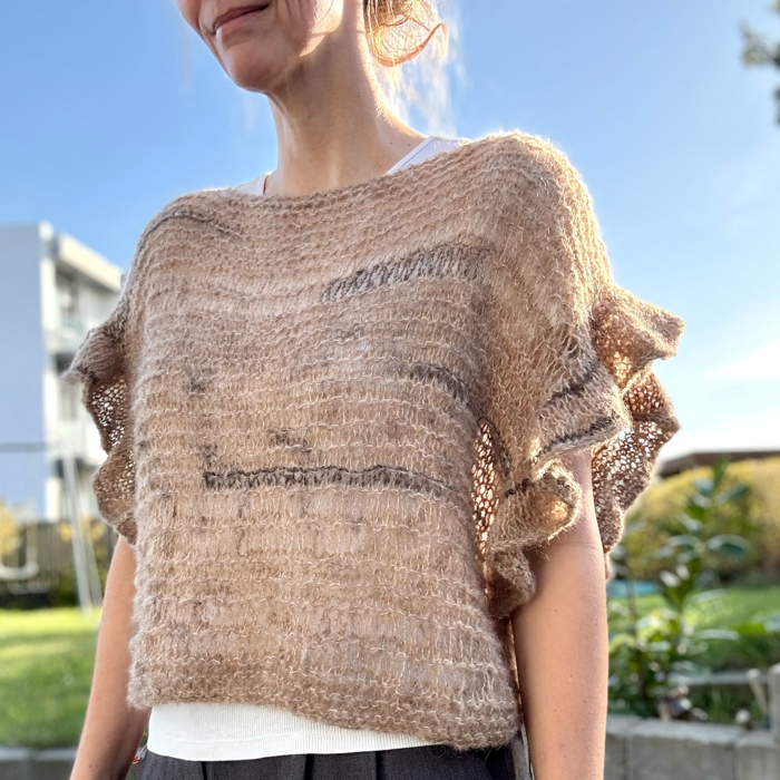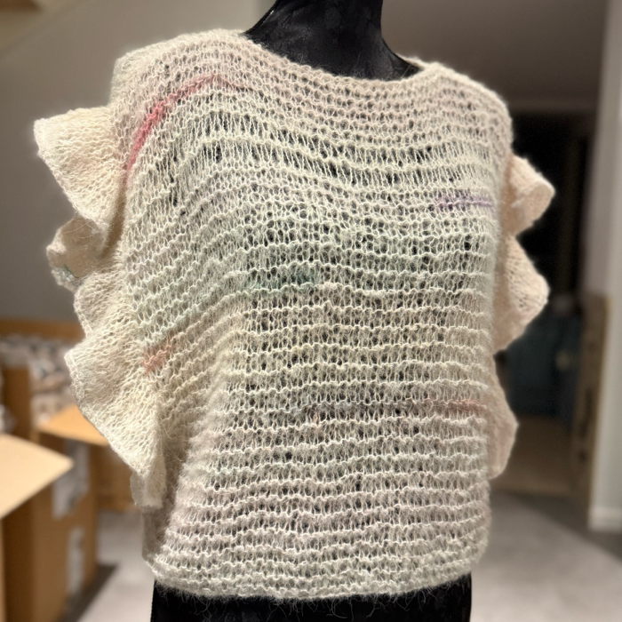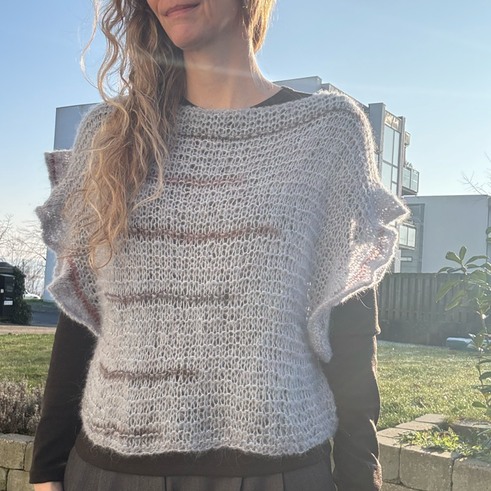 Blød, varm og feminin vinter top med flæse strikket i Nellie garn fra Permin. Passer perfekt til efterår og vinter som vest eller top udover kortærmet eller langærmet.