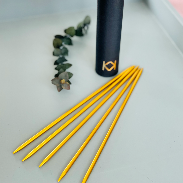 Strømpepindene har en fin guldfarve og de er 20 cm lange.